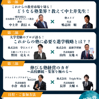 塾エイドでは、これまで学習塾の経営を支援するために様々な情報を提供してまいりました。今回のフォーラムでは、これまでいただいたご意見やご質問を元に、学習塾業界の未来をテーマにした討論を行います。著名な講師陣が登壇し、塾経営に役立つ戦略や考え方を共有いたします。