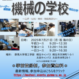 高校生向け科学体験イベント『一日体験理工学教室 機械の学校』は,大学の施設・実験装置を使って機械工学(材料工学,制御工学,電子工学,情報工学も)の面白さを体験できる 無料科学体験イベントです.対面のテーマは群馬大学理工学部桐生キャンパスに加え,新たに太田キャンパスでも実施します!一人でも,友人と一緒でも,お気軽にご参加ください. オンラインのテーマは全国どこからでも参加できます!ご自宅からご家族と一緒に,高校の先生や友人のみなさんと一緒に,ご参加ください.