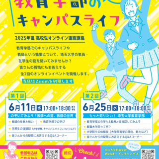埼玉大学教育学部が主催する、教師を目指す高校生向けのオンライン講座です。教員や在学生が、教師の仕事の魅力や大学生活について紹介し、参加者の疑問に答えます。第1回では教師の仕事や教育学部での学び、第2回では各課程・専修の教員・学生との交流を予定しています。Zoomを使用し、参加費は無料。各回定員300名で、全国の高校1~3年生が対象です。申込締切は6月1日(日)です。