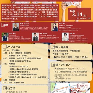 大阪教育大学 みらい教育共創館と株式会社読売新聞社大阪本社の共催による「メディアと連携した教育って、なに?~探究、情報リテラシー~」が、2026年3月14日(土)14:00~17:00に対面形式で実施予定です。