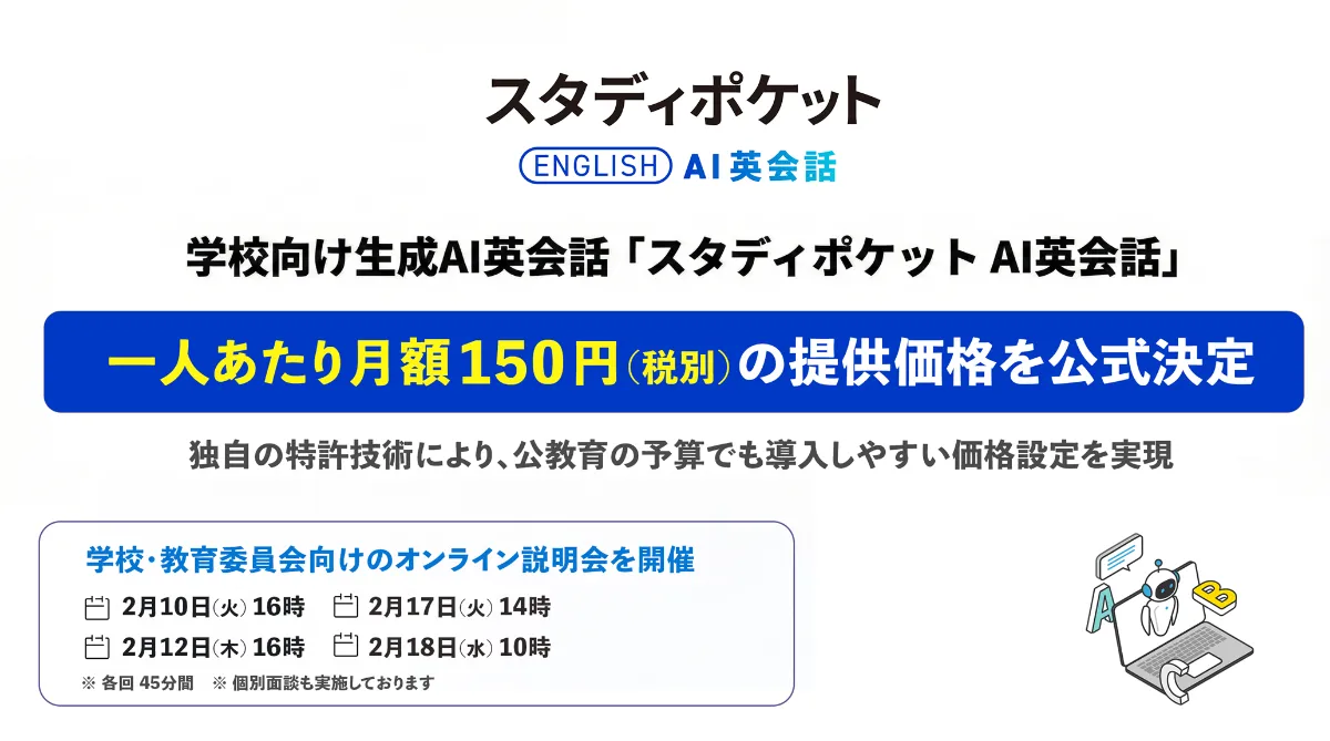 eラーニング 英語教育 2026.02.09 4月に提供予定の学校向けAI英会話サービス「スタディポケット AI英会話」、1名あたりの月額を税別150円に設定 AI英会話 ICT教材 スタディポケット 教員支援 生成AI 英語教育