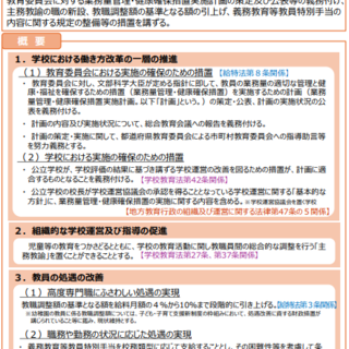 加えて、教育委員会に対し「働き方改革に関する計画の策定とその公表」を義務付け、学校内に「主務教諭」という新たな管理職を位置づけて、組織的なマネジメント体制を整備。