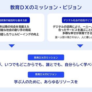 教育DXのミッションやビジョンとして「誰もがいつでもどこでも自分らしく学べる社会」や「学ぶ人のために、あらゆるリソースを」などを掲げ、特に教職員の負担軽減のため、アナログ業務をデジタル化する「12のやめることリスト(デジタルに変えること)」を整理。