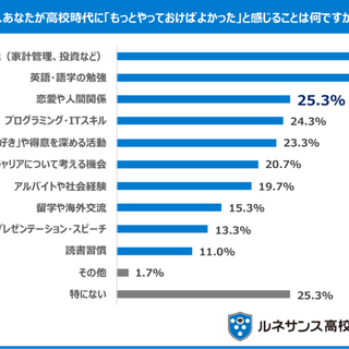 ビジネスパーソンに「高校時代にもっと学んでおけばよかったこと」を尋ねた結果、1位「お金の知識(家計管理、投資など)」35.7%、2位「英語・語学の勉強」34.7%という回答が得られました。